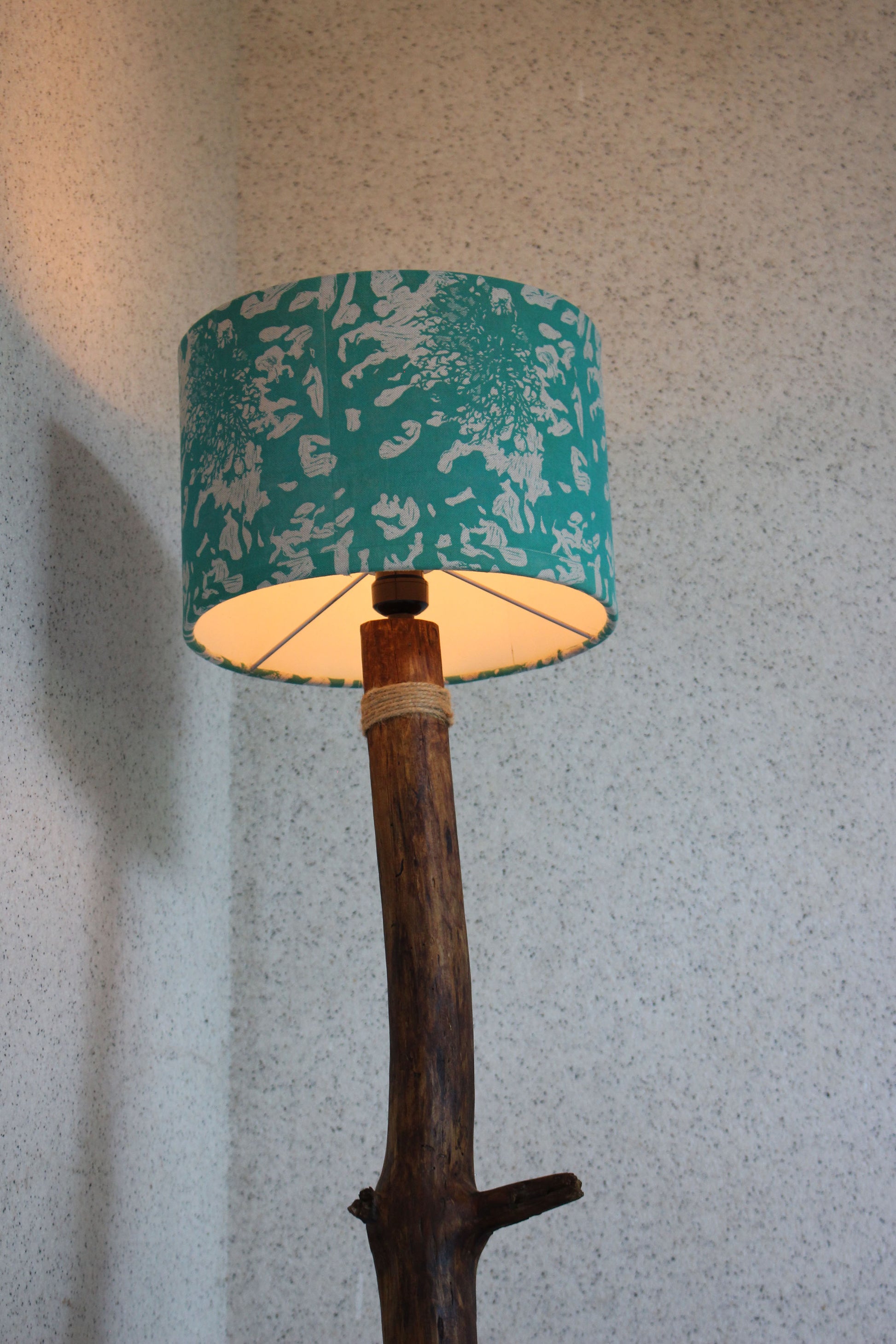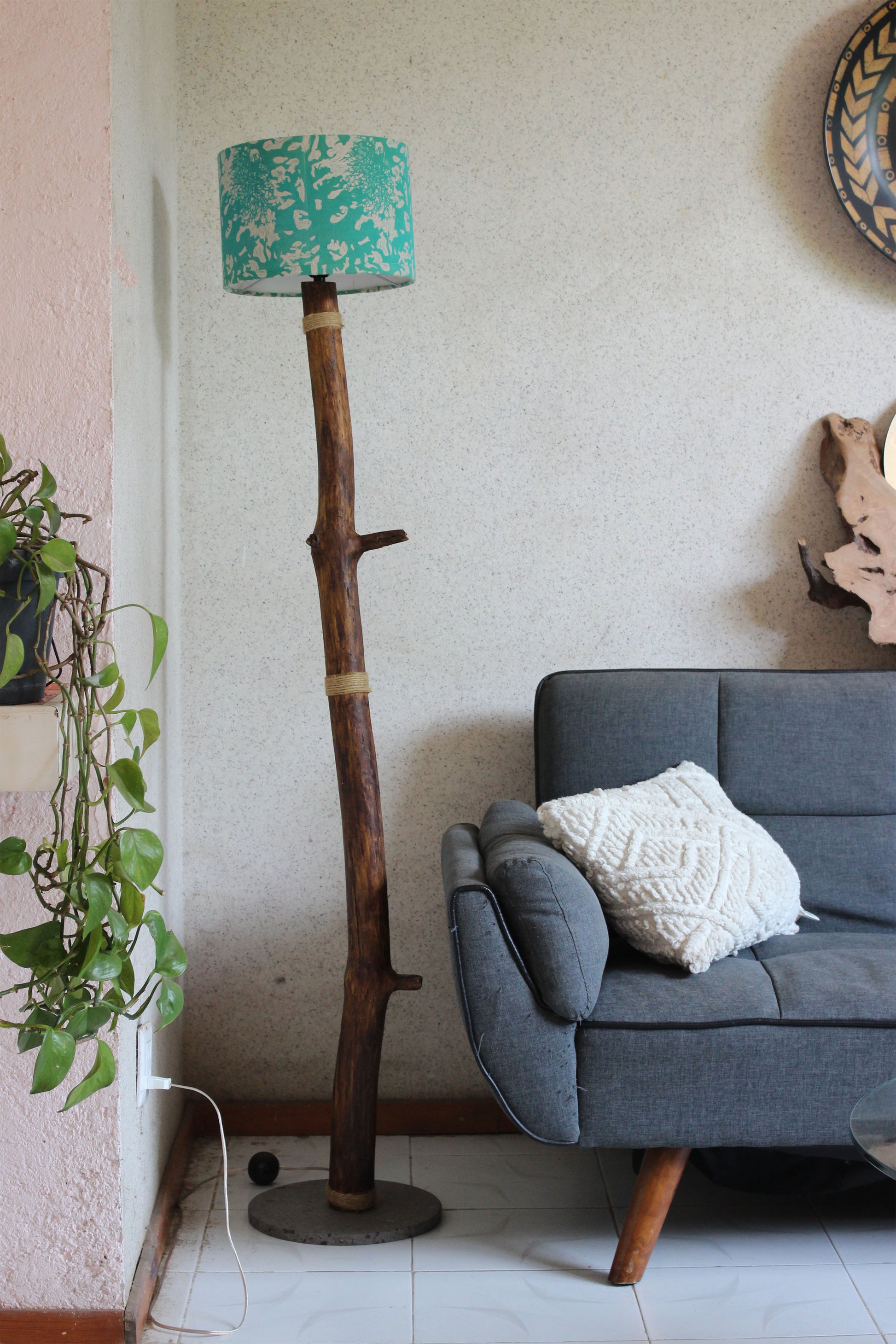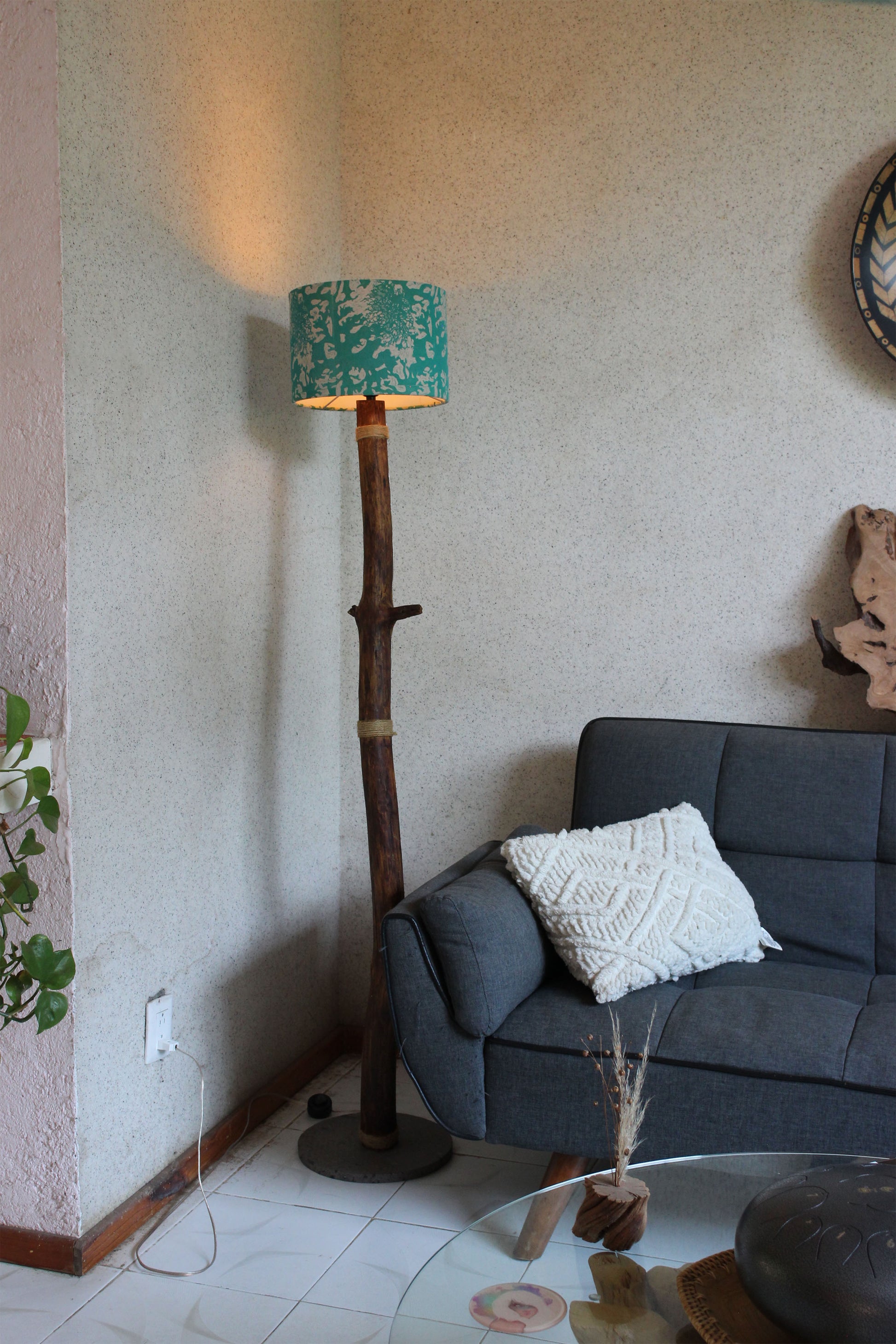 Lámpara de piso artesanal que fusiona tradición y diseño contemporáneo. Elaborada con madera de pino recuperada, trabajada meticulosamente a mano, descansa sobre una base de cantera negra que proporciona estabilidad y elegancia. Su pantalla de linoleo, estampada con el exclusivo diseño textil de la artista María Antonieta de la Rosa, convierte cada pieza en una obra única. Ideal para espacios que valoran la artesanía, la sostenibilidad y el arte mexicano auténtico.