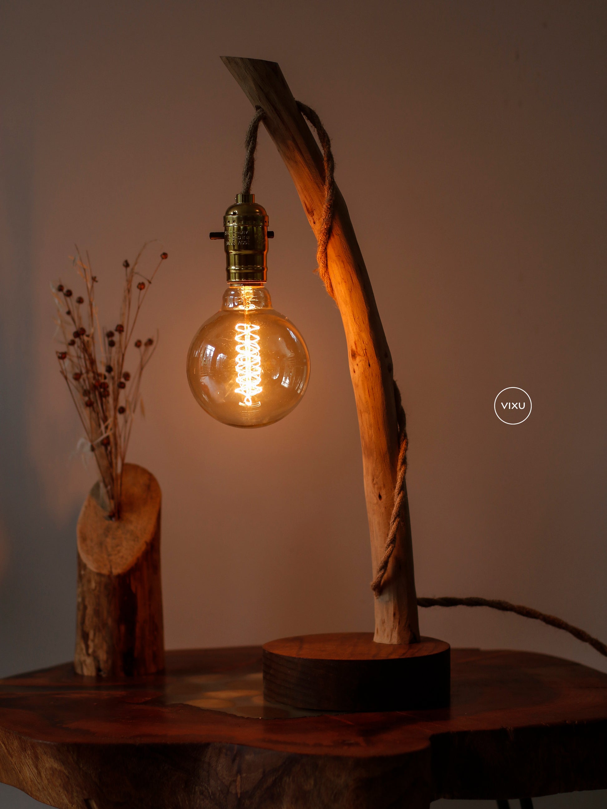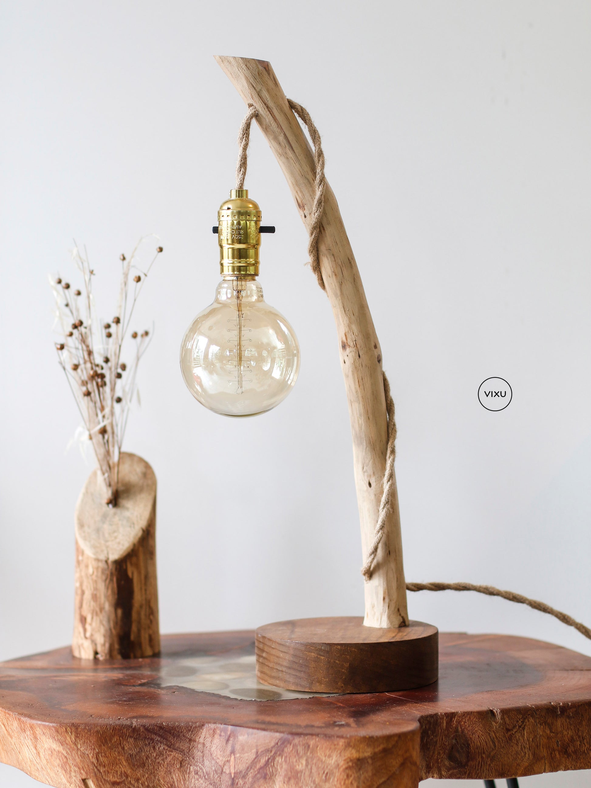 - Lámpara hecha artesanalmente con madera recuperada de pino y fresno.