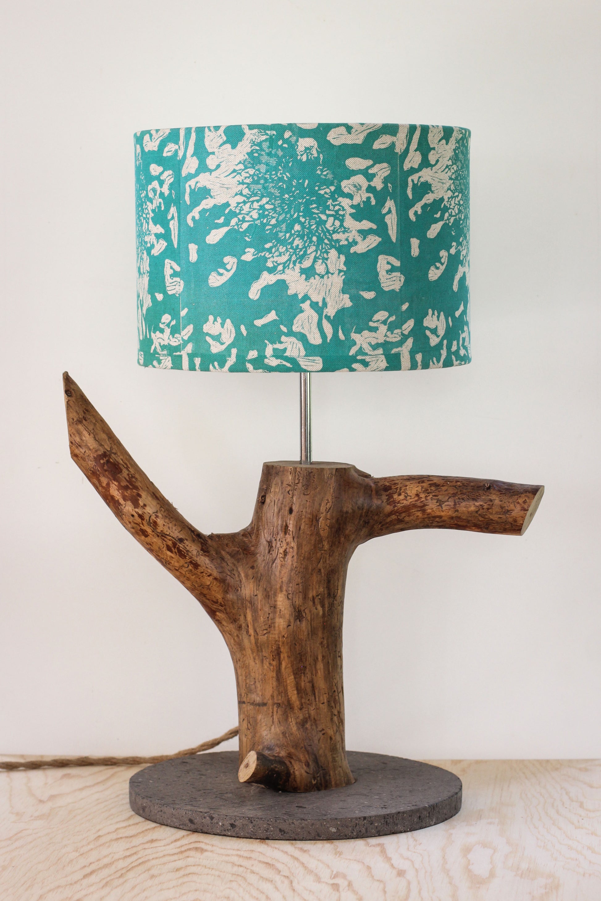 Lámpara artesanal única que fusiona tradición y diseño contemporáneo. Estructura elaborada en madera de pino y base de cantera, coronada por una pantalla textil creada por la artista Ma Antonieta de la Rosa. La tela presenta un estampado exclusivo realizado mediante técnica de linóleo, teñida con tinta natural. Cada pieza es única, reflejando la maestría artesanal y el compromiso con materiales nobles y procesos tradicionales mexicanos.