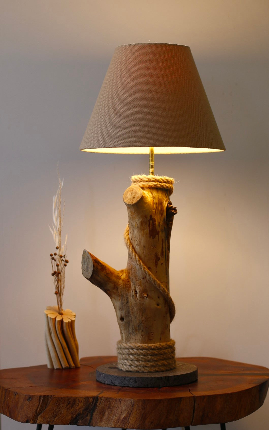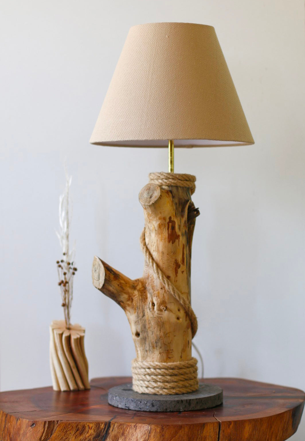 - Lámpara hecha a mano con madera de pino