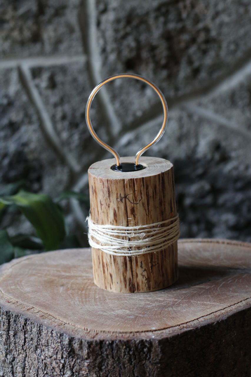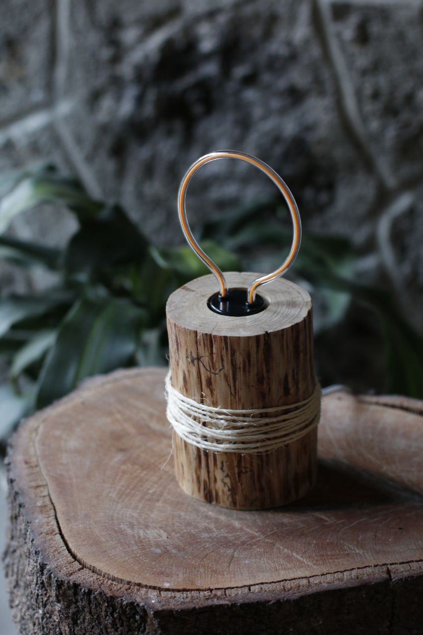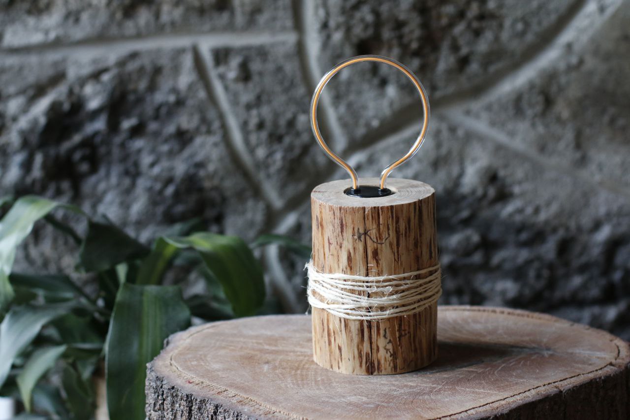 - Lámpara hecha artesanalmente con madera de pino rescatada.