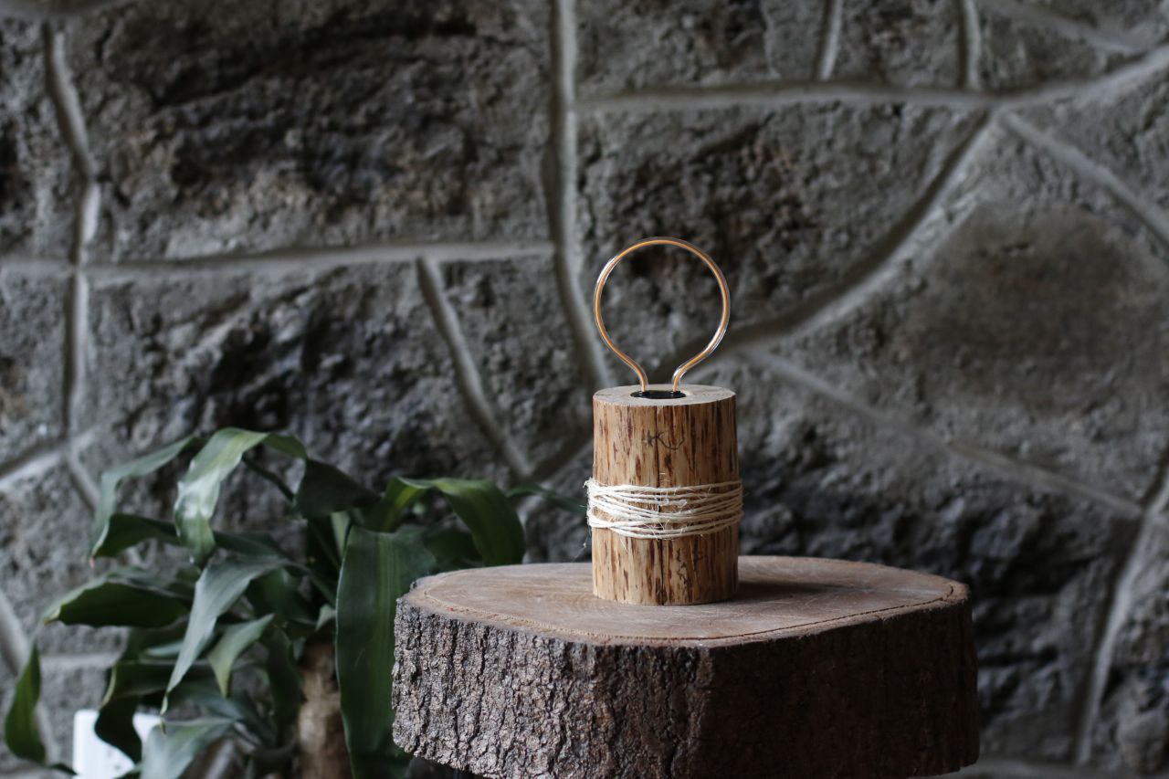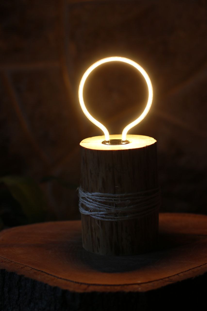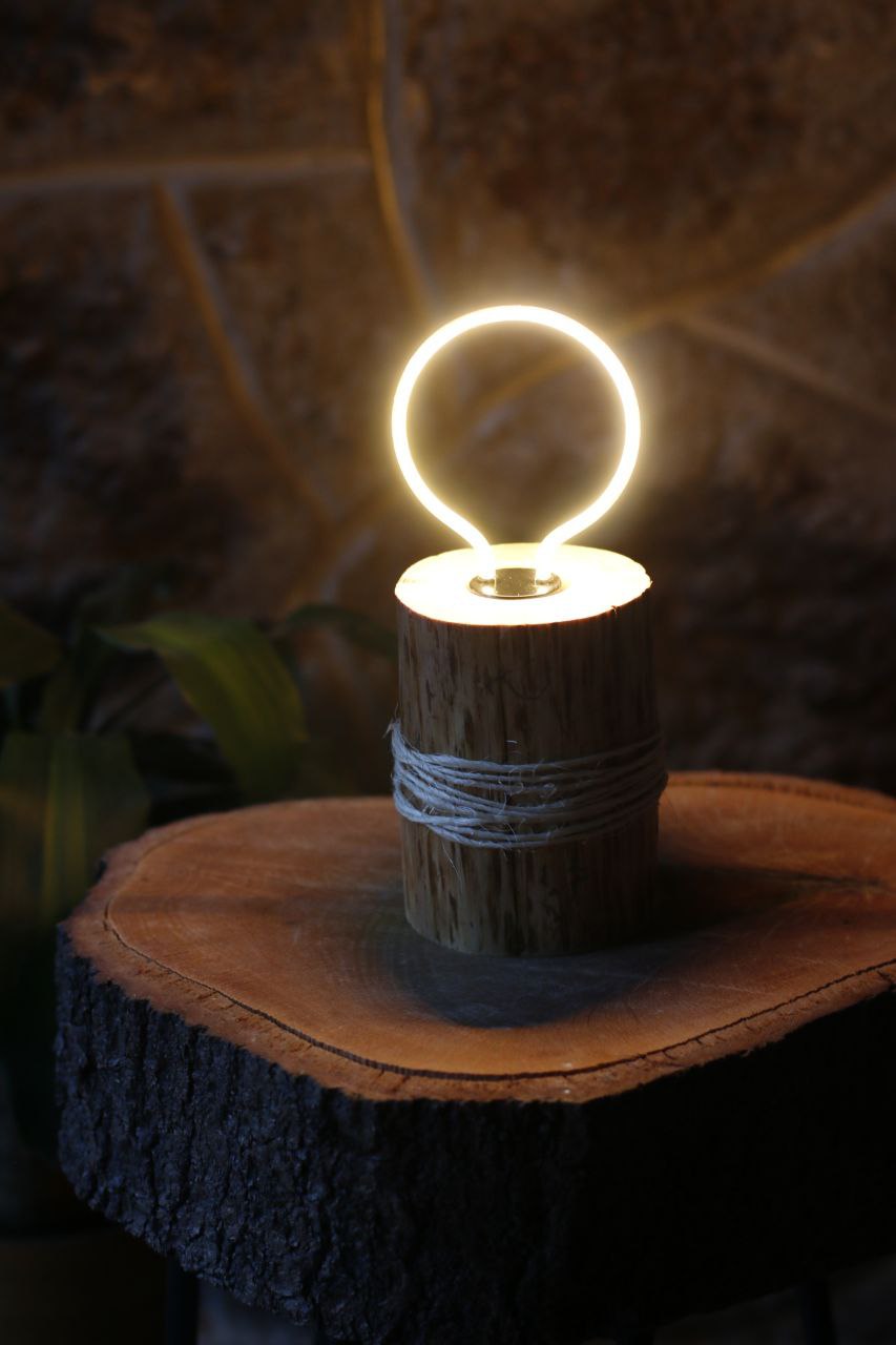 - Lámpara hecha artesanalmente con madera de pino rescatada.