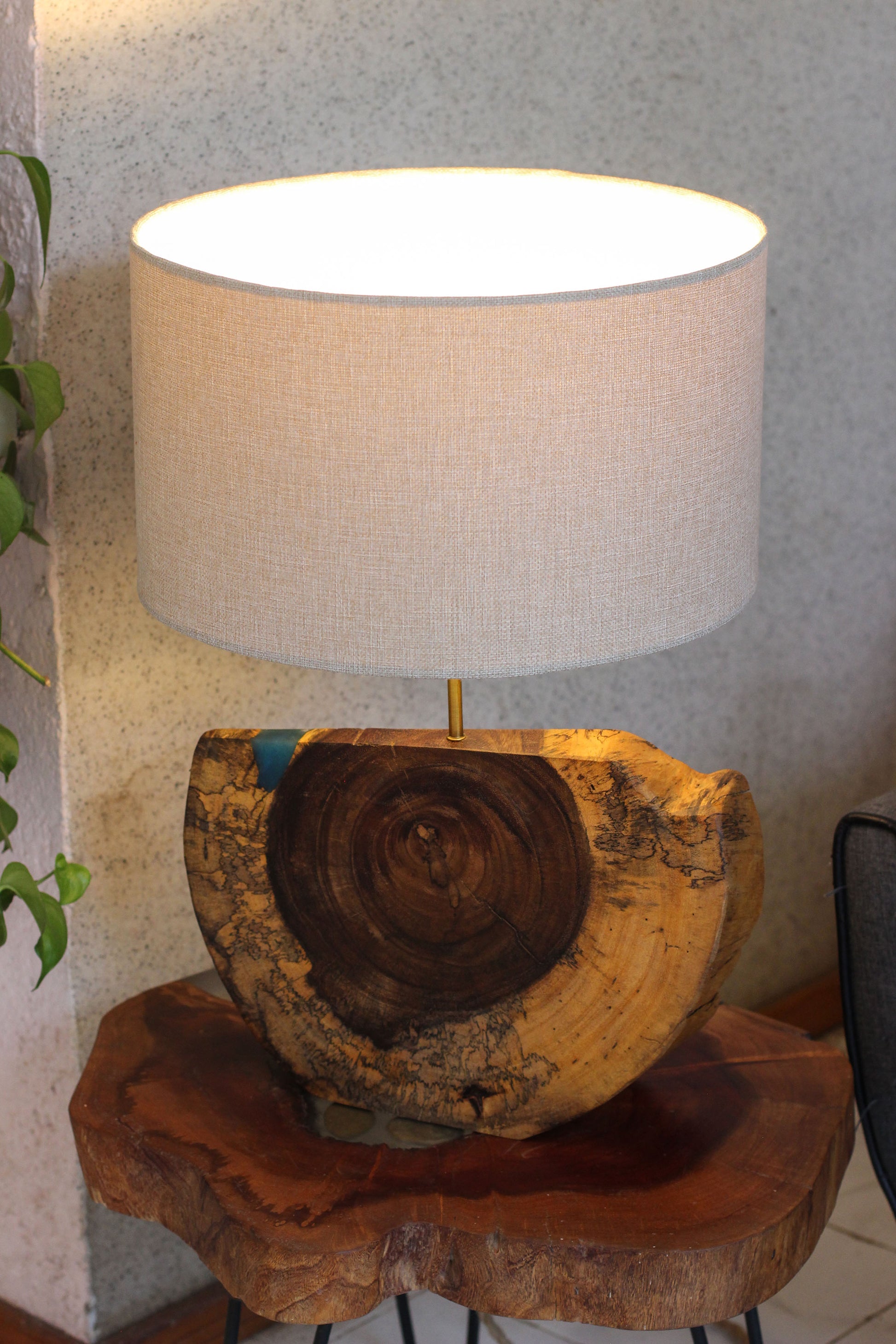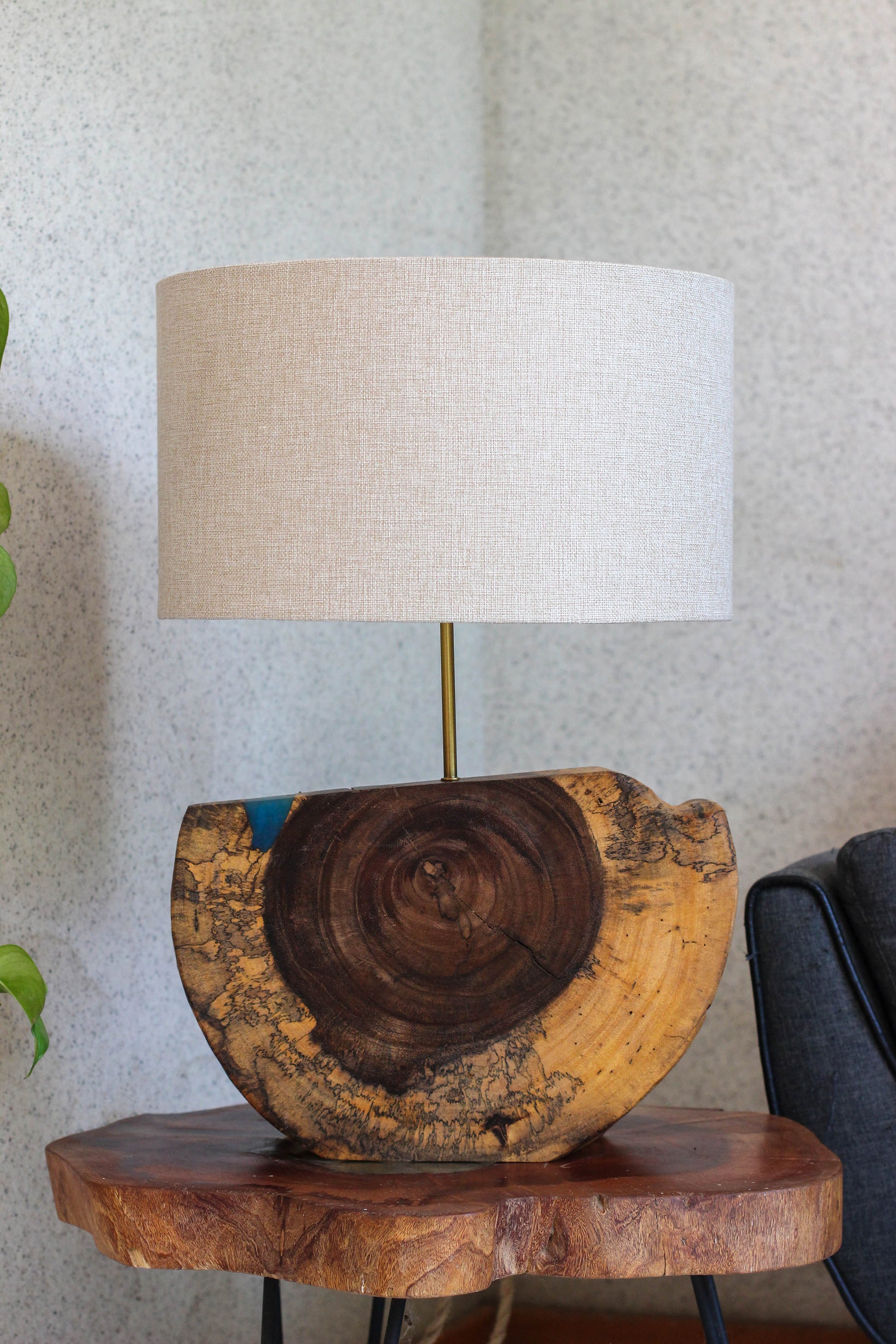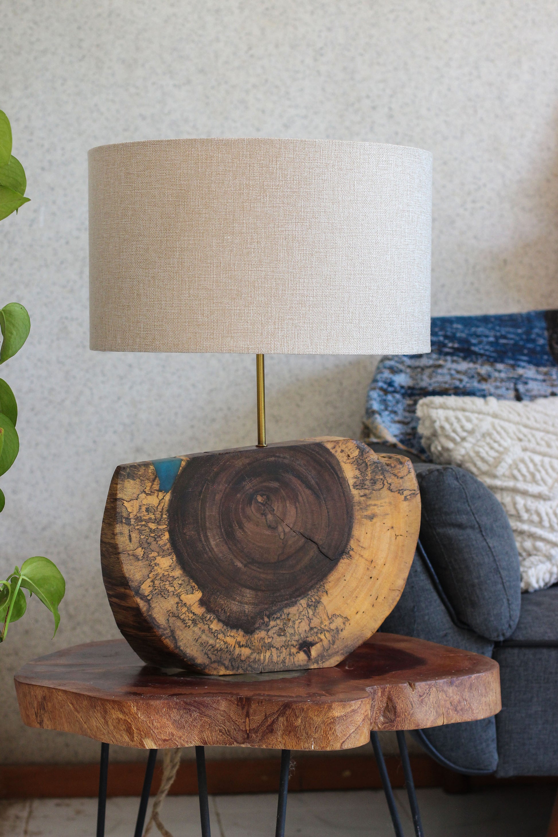 Lámpara artesanal elaborada con madera de parota rescatada, transformando materiales nobles en una pieza funcional y decorativa. Es una pieza única, caracterizada por su construcción manual y un delicado detalle de resina azul que añade sofisticación visual. La pantalla de tela beige de 40 cm de diámetro proporciona una iluminación cálida y difusa, ideal para crear ambientes acogedores. Una inversión en diseño sustentable que combina tradición artesanal con estética contemporánea.
