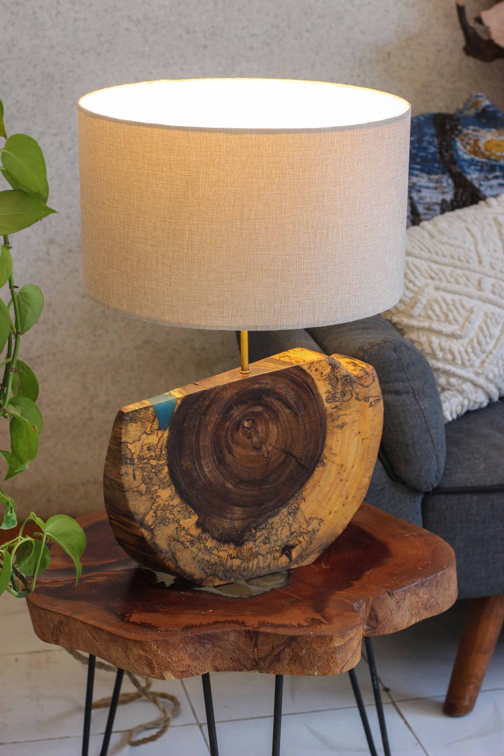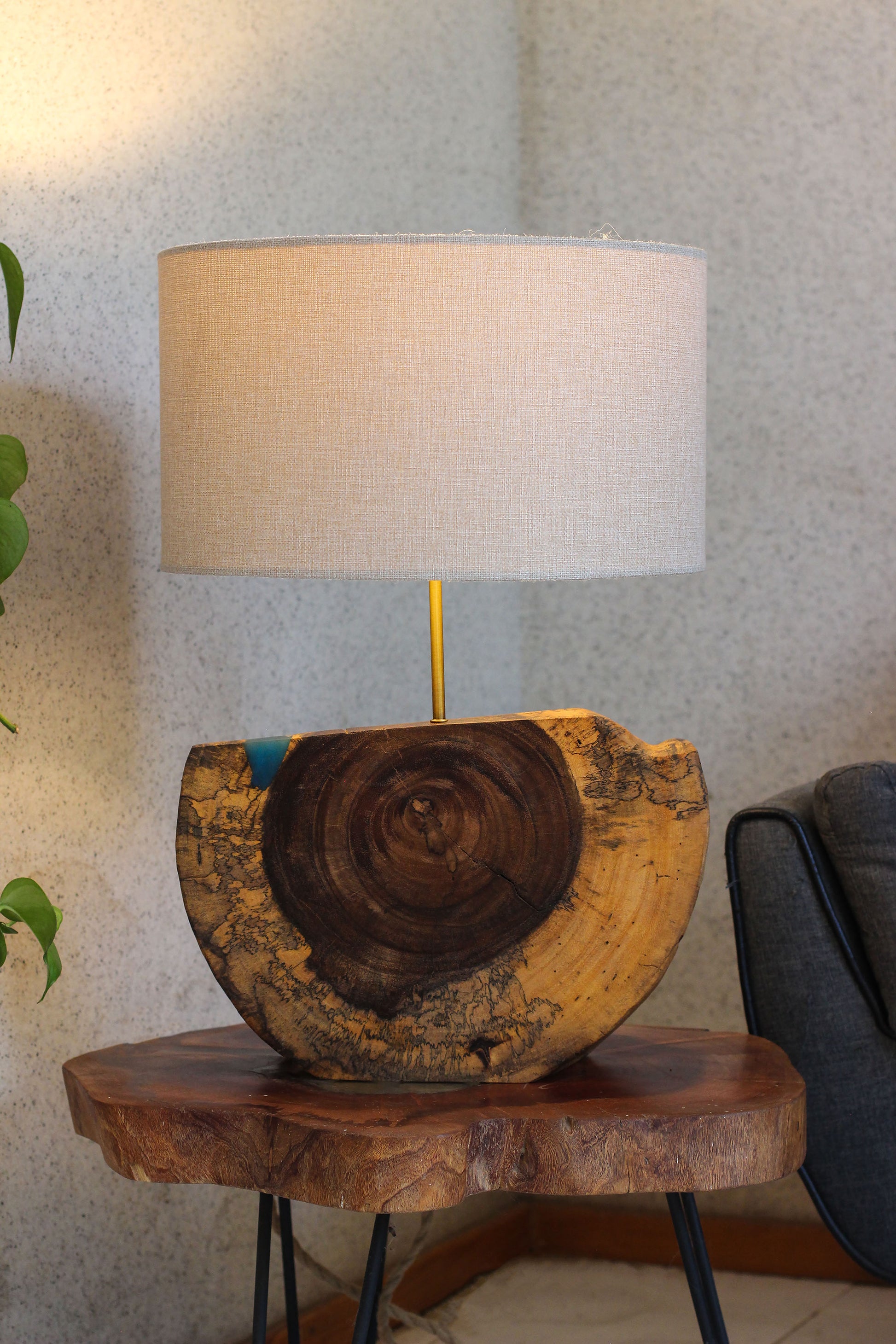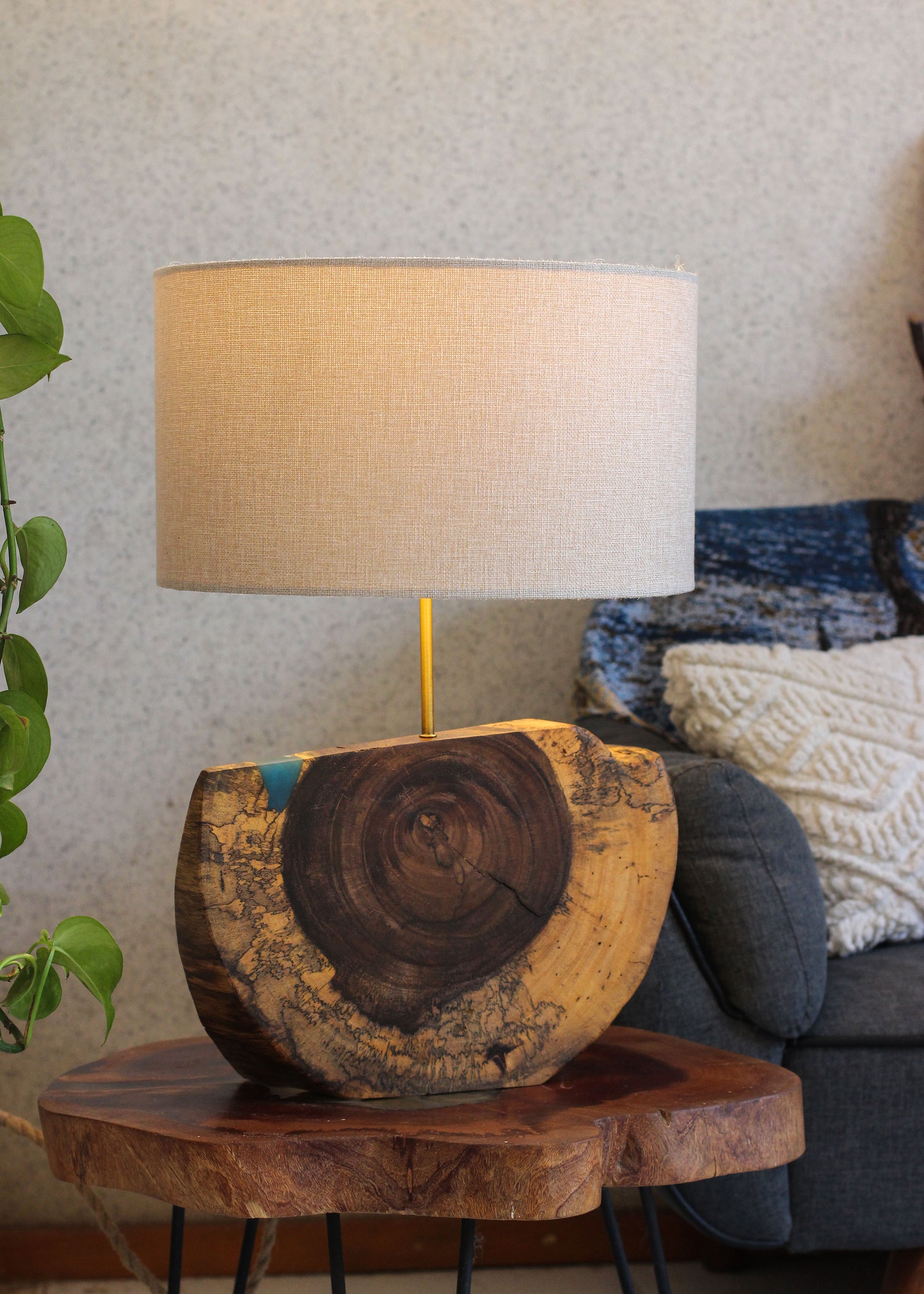 Lámpara artesanal elaborada con madera de parota rescatada, transformando materiales nobles en una pieza funcional y decorativa. Es una pieza única, caracterizada por su construcción manual y un delicado detalle de resina azul que añade sofisticación visual. La pantalla de tela beige de 40 cm de diámetro proporciona una iluminación cálida y difusa, ideal para crear ambientes acogedores. Una inversión en diseño sustentable que combina tradición artesanal con estética contemporánea.