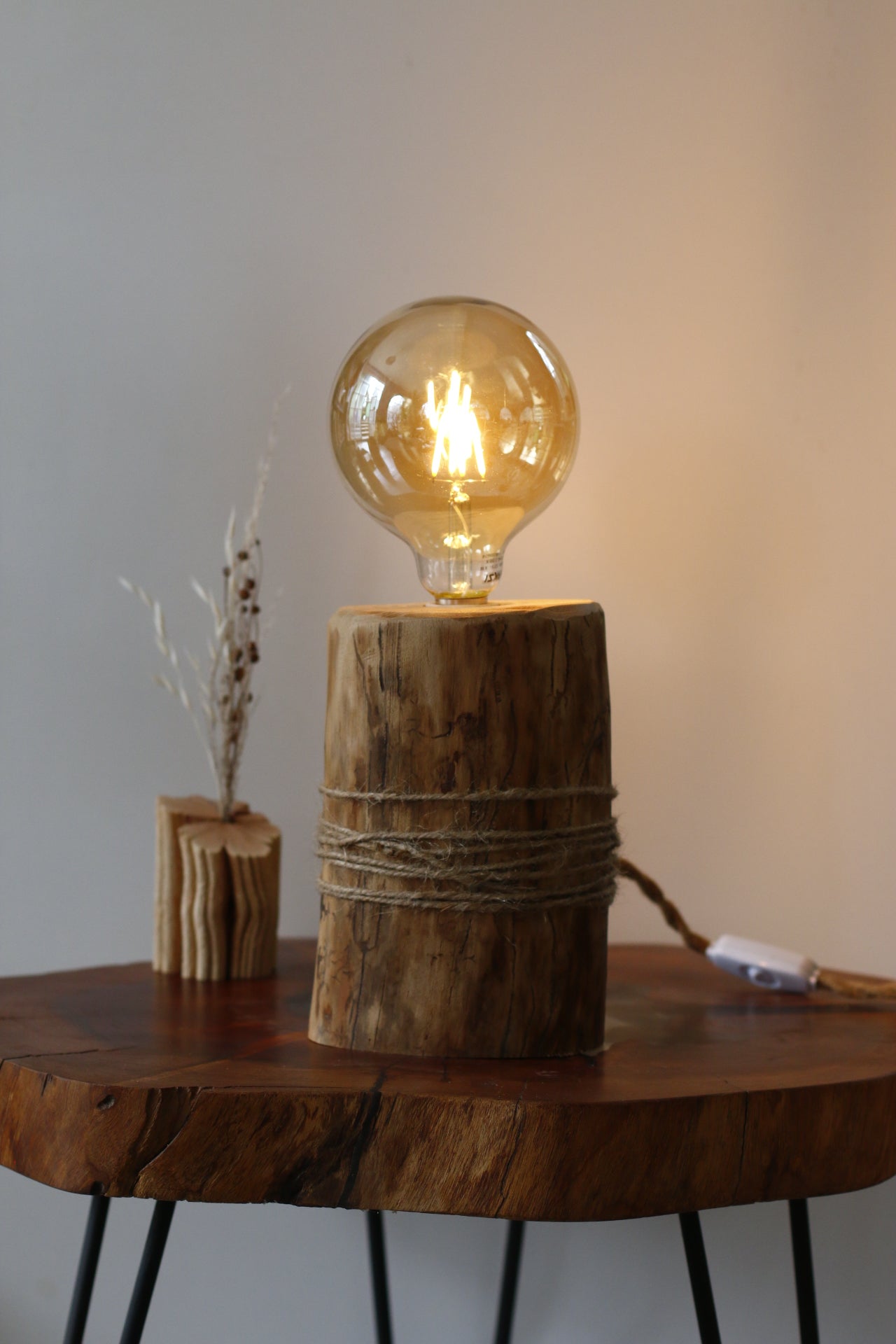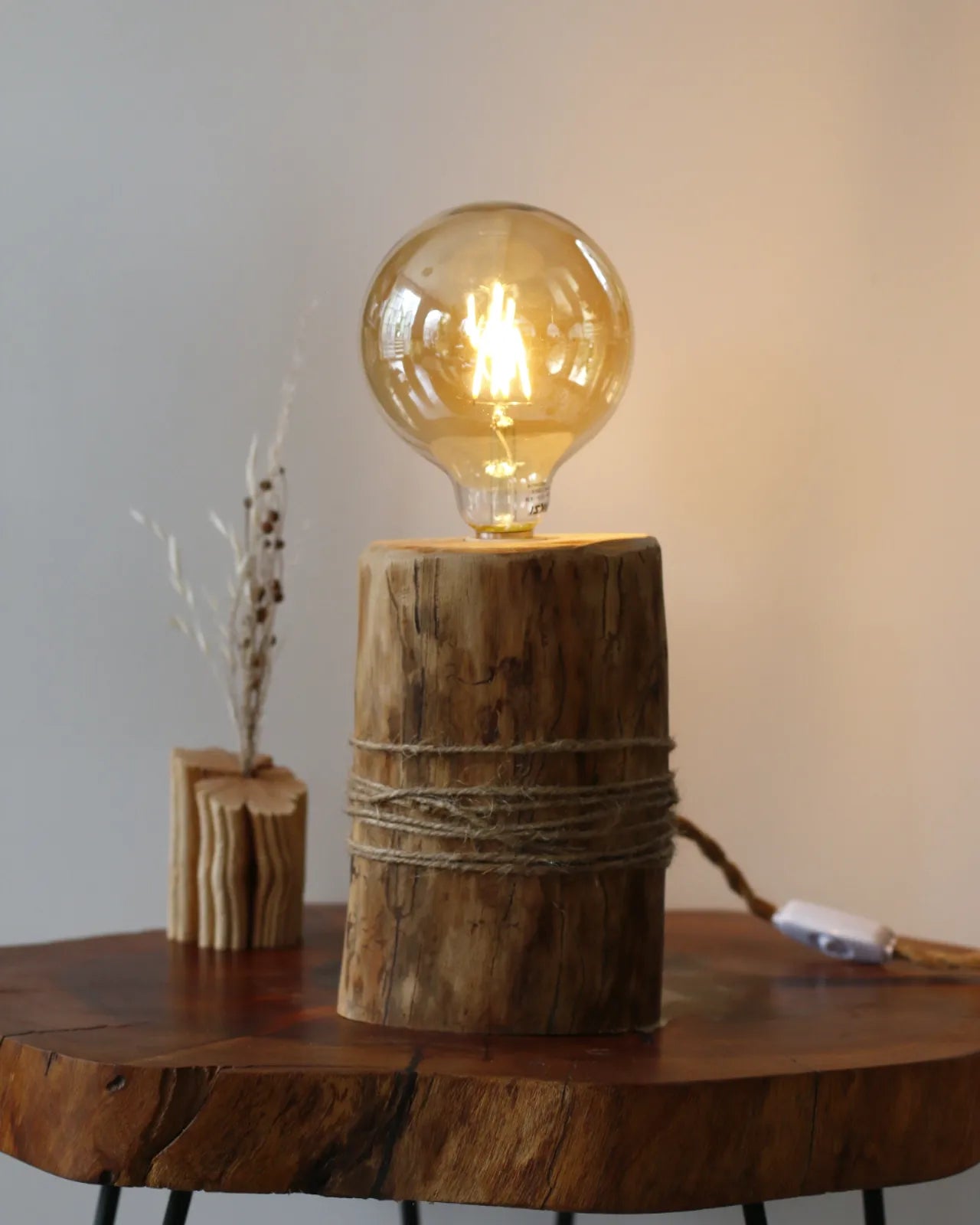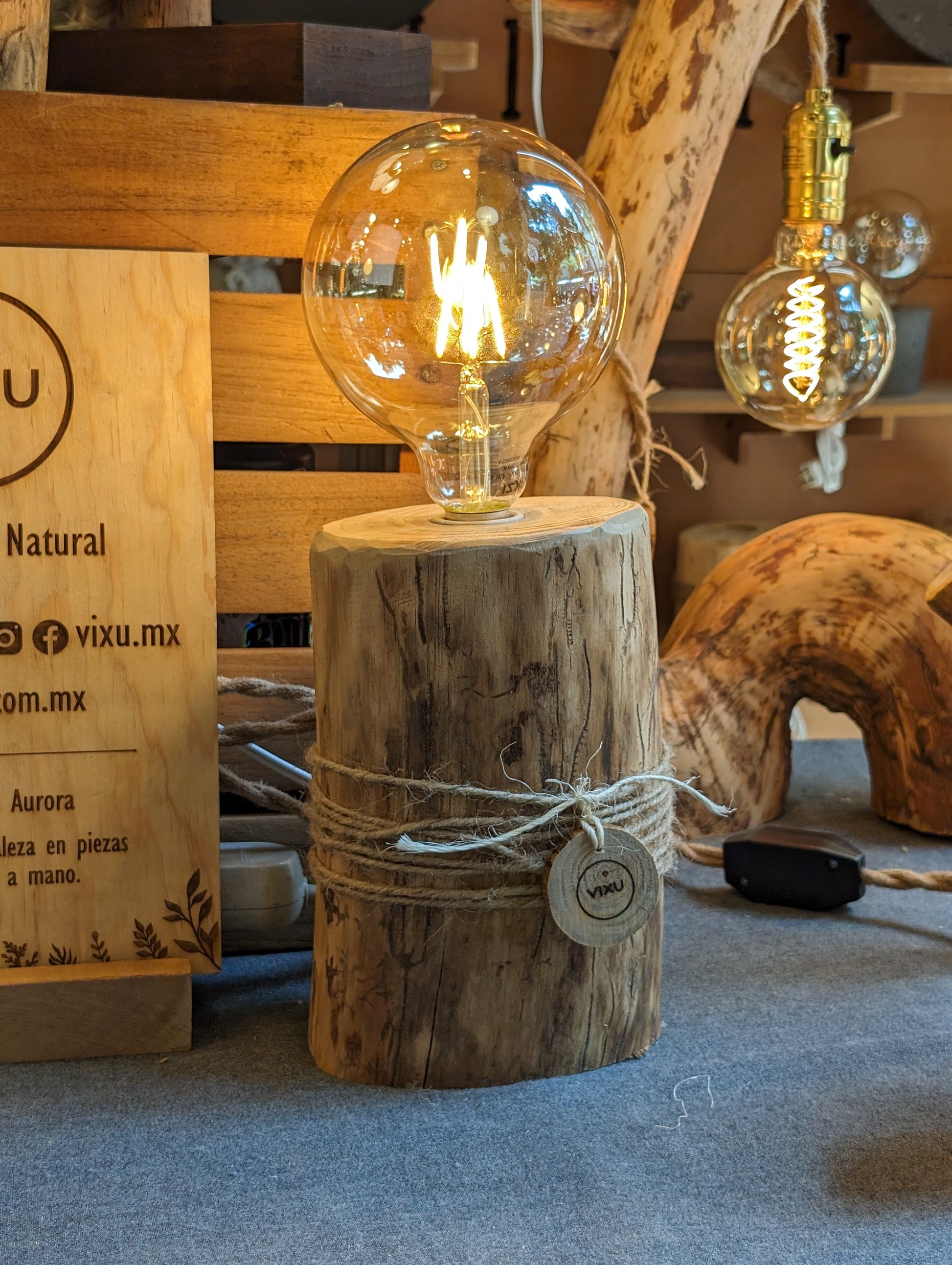 - Lámpara hecha artesanalmente con madera de pino recuperada.