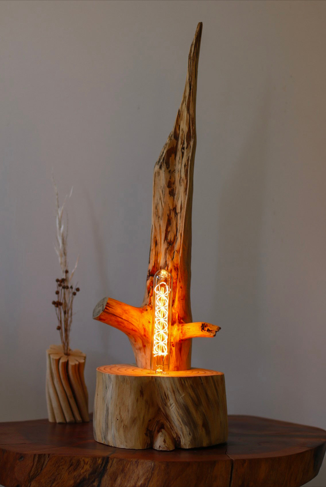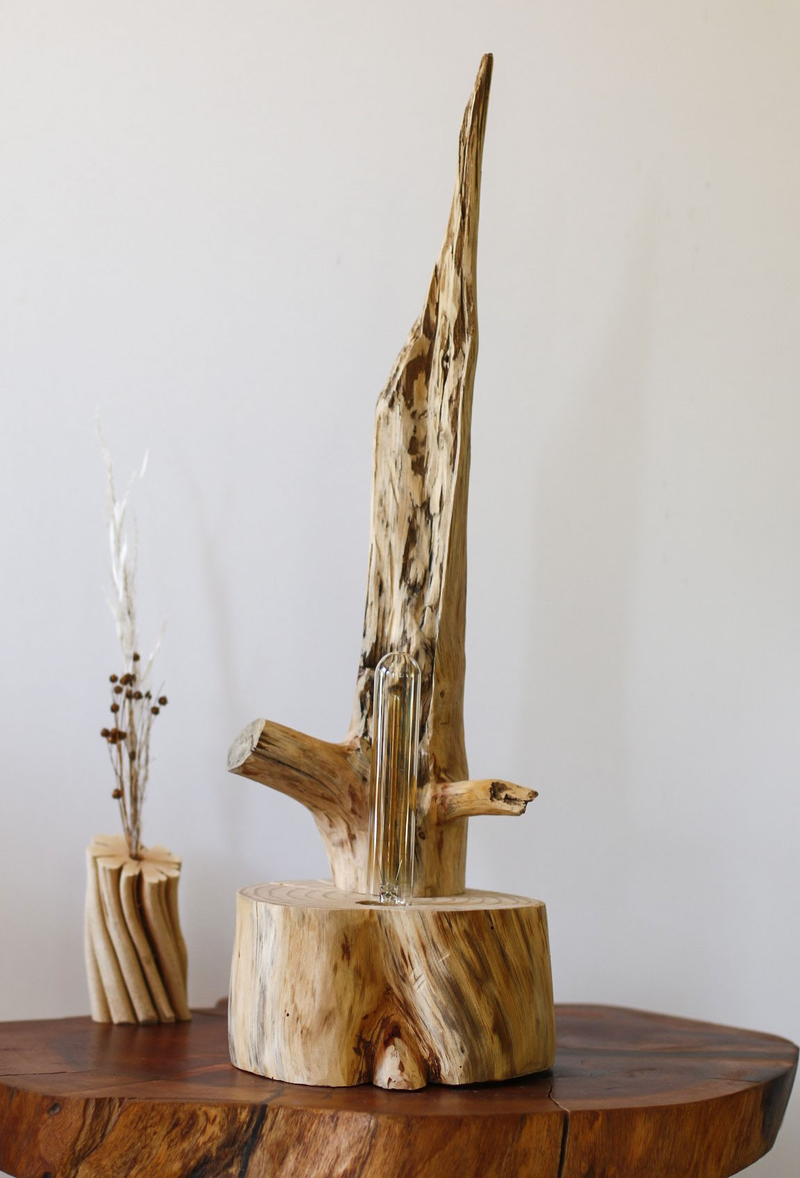 - Lámpara artesanal hecha con madera de pino rescatada.